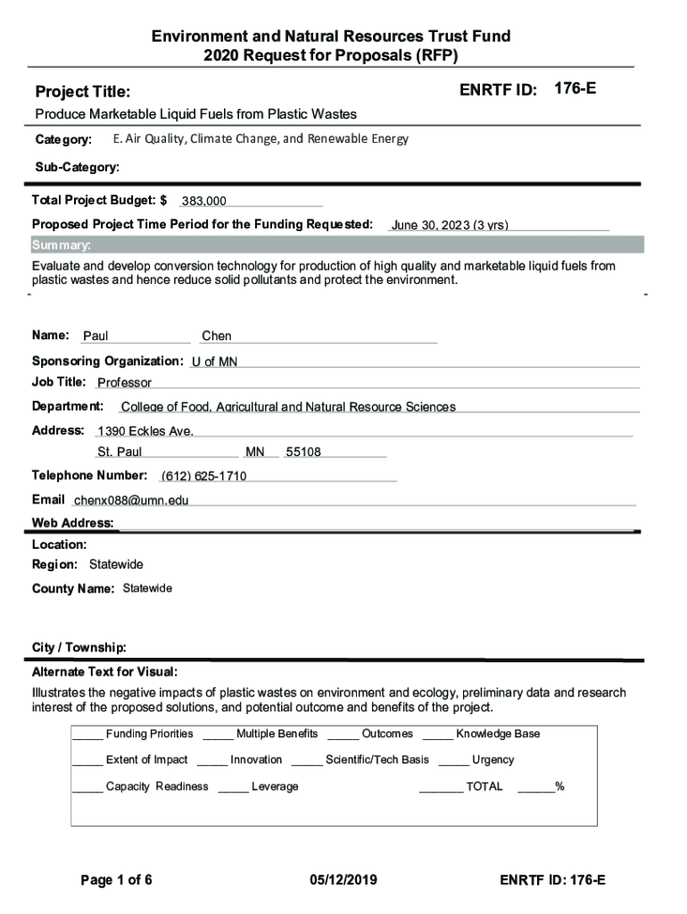 Environment and Natural Resources Trust Fund 2020 Request for Proposals (RFP) EN RTF ID:Project Title:176EProduce Marketable Liquid Fuels from Plastic Wastes E. Air Quality, Climate Change, and Renewable