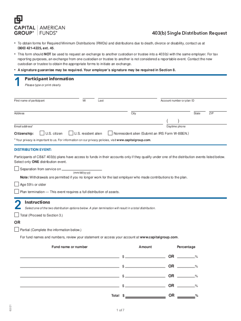 Clear and reset form403(b) Single Distribution Request To obtain forms for Required Minimum Distributions (Rods) and distributions due to death, divorce or disability, contact us at (800) 4214225,