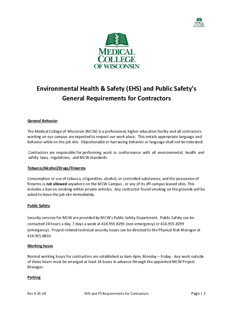 Environmental Health & Safety (EHS) and Public Safeties General Requirements for Contractors General Behavior The Medical College of Wisconsin (MCG) is a professional, higher education facility and