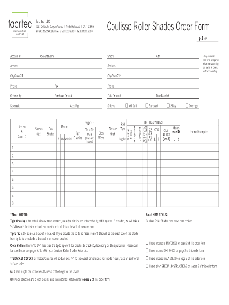 Fabric, LLC. WINDOW COVERINGS TO THE TRADEAccount #Coulis Roller Shades Order Form7531 Goldwater Canyon Avenue | North Hollywood | CA | 91605 tells 800.828.2500 (toll-free) or 818.503.8300 | fax 818.503.8360p.1