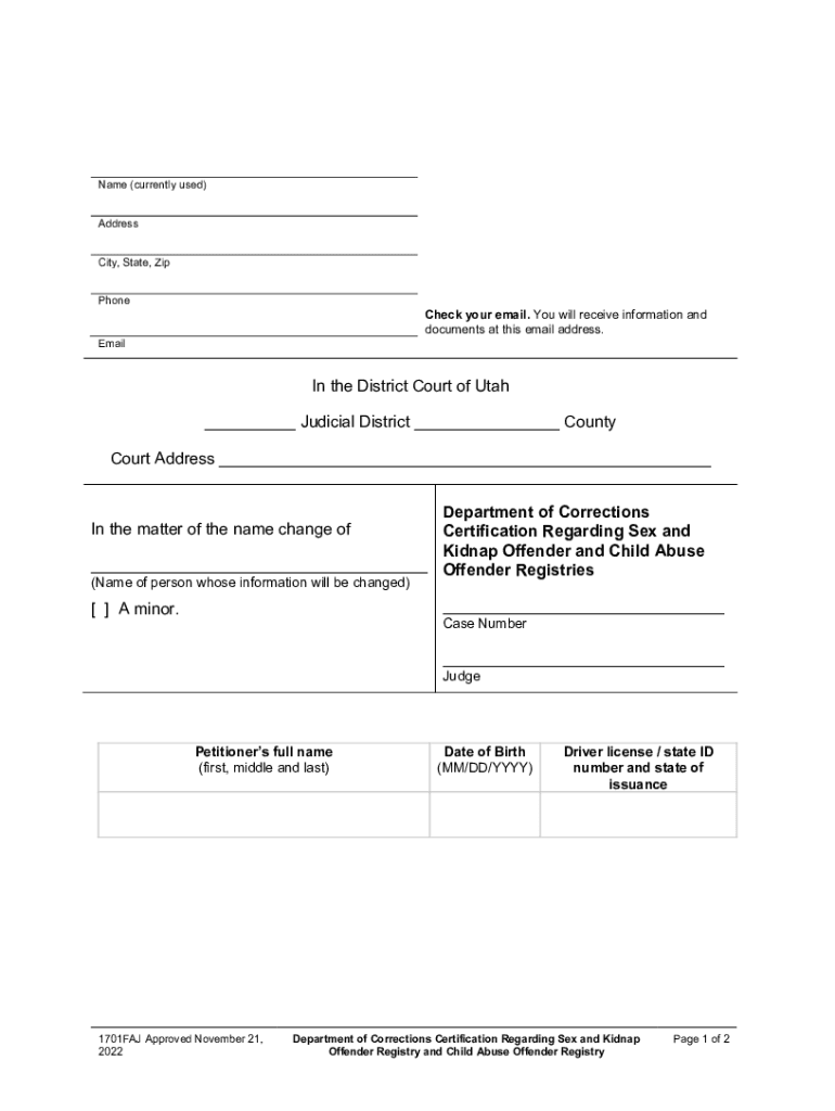 Name (currently used) Address City, State, Zip Precheck your email. You will receive information and documents at this email address. Emailing the District Court of Utah ___ Judicial District ___