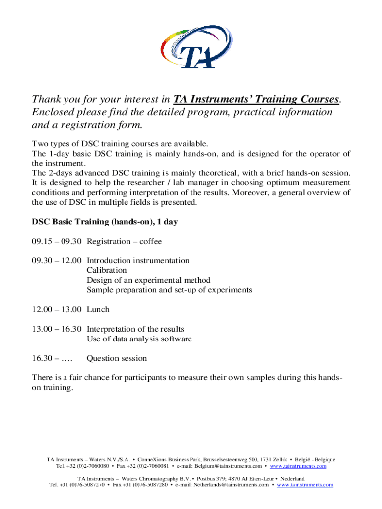 Thank you for your interest in TA Instruments Training Courses. Enclosed please find the detailed program, practical information and a registration form. Two types of DSC training courses are available.