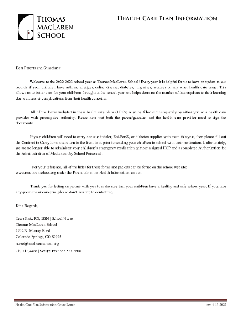 Health Care Plan Informational Parents and Guardians: Welcome to the 20222023 school year at Thomas Maclaren School! Every year it is helpful for us to have an update to our records if your child/men