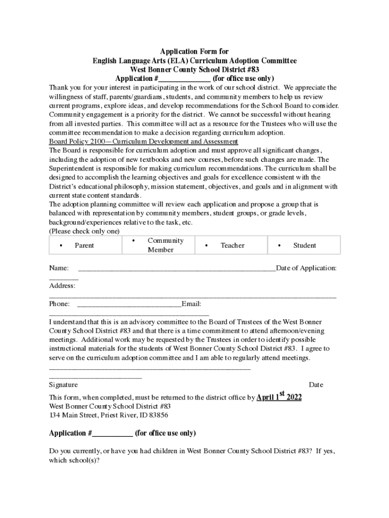 Application Form for English Language Arts (ELA) Curriculum Adoption Committee West Bonner County School District #83 Application #___ (for office use only) Thank you for your interest in participating