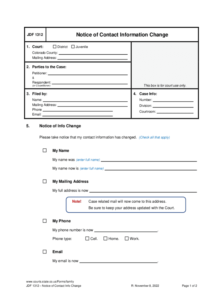 Notice of Contact Information Changed 1312 1. Court:DistrictJuvenileColorado County: Mailing Address:2. Parties to the Case: Petitioner: respondent:This box is for court use only.(or Copetitioner)3.