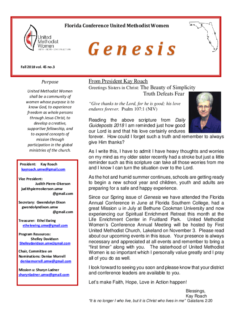 Florida Conference United Methodist Women Genesis Fall 2018 vol. 45 no.3Purpose United Methodist Women shall be a community of women whose purpose is to know God, to experience freedom as whole persons