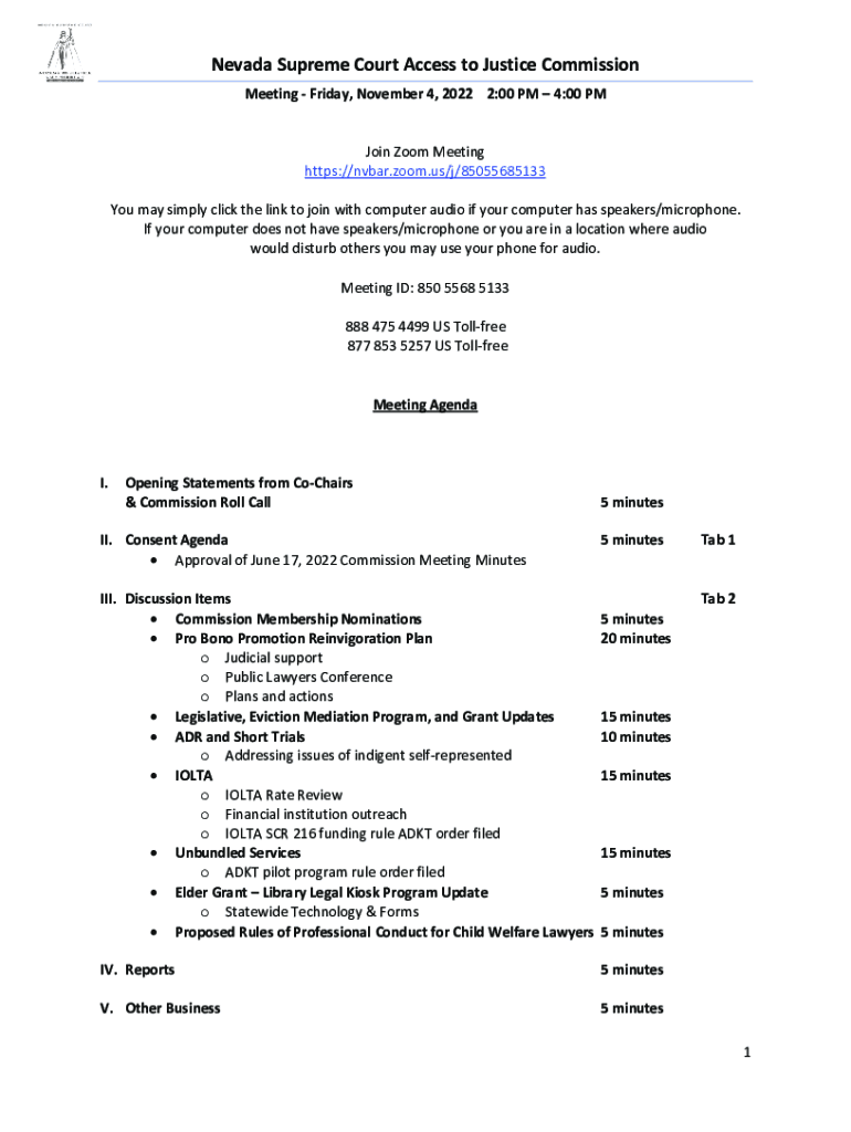 Nevada Supreme Court Access to Justice Commission Meeting Friday, November 4, 2022 2:00 PM 4:00 PM Join Zoom Meeting https://nvbar.zoom.us/j/85055685133 You may simply click the link to join with