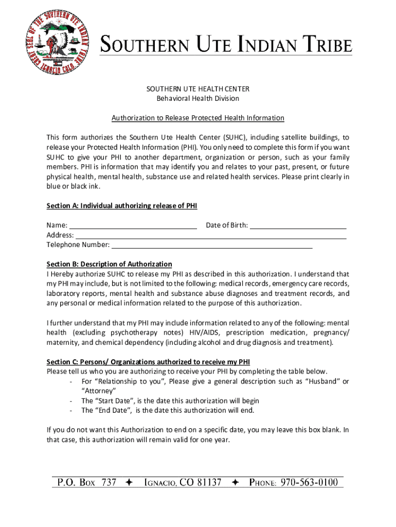 SOUTHERN UTE HEALTH CENTER Behavioral Health Division Authorization to Release Protected Health Information This form authorizes the Southern Ute Health Center (SUMC), including satellite buildings,