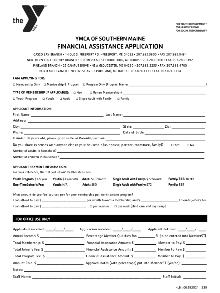 YMCA OF SOUTHERN MAINEFINANCIAL ASSISTANCE APPLICATION CISCO BAY BRANCH 14 OLD S. FREEPORT RD. FREEPORT, ME 04032 207.865.9600 FAX 207.865.0484 NORTHERN YORK COUNTY BRANCH 3 POWERLESS ST MIDDLEFORD,