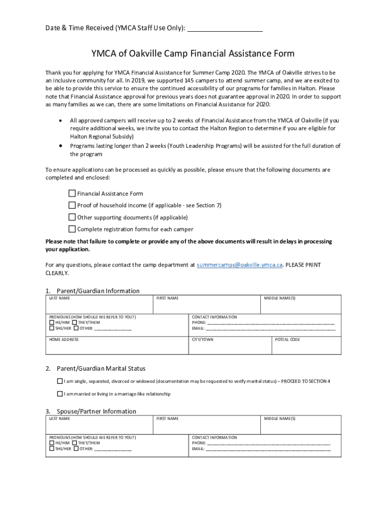 Date & Time Received (YMCA Staff Use Only): ___YMCA of Oakville Camp Financial Assistance Form Thank you for applying for YMCA Financial Assistance for Summer Camp 2020. The YMCA of Oakville strives