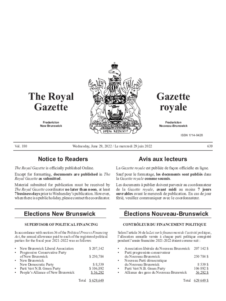 The Royal GazetteGazette royaleFredericton New Brunswick Fredericton NouveauBrunswick ISSN 17149428Vol. 180Wednesday, June 29, 2022 / Le Merced 29 join 2022Notice to Readers639Avis aux lecteursThe