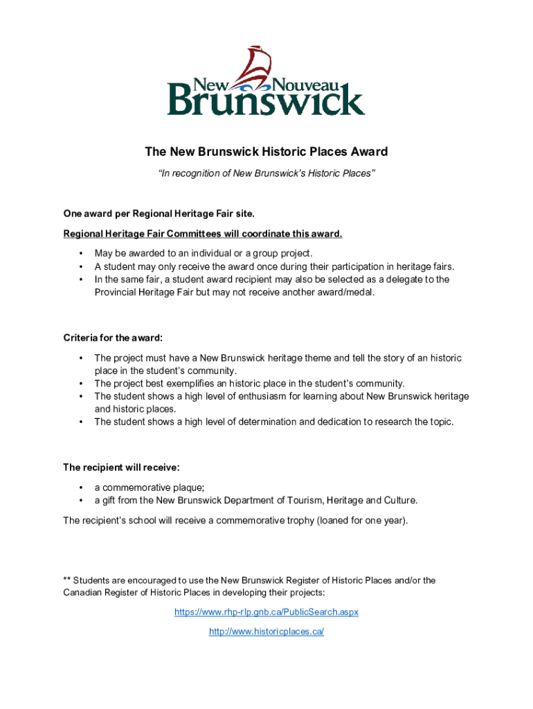 The New Brunswick Historic Places Award In recognition of New Brunswick's Historic Places award per Regional Heritage Fair site. Regional Heritage Fair Committees will coordinate this award. May be