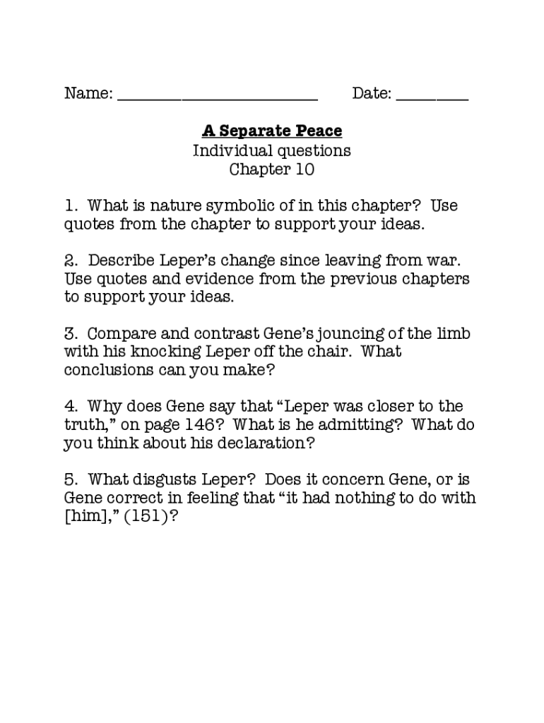 Name: ___Date: ___A Separate Peace Individual questions Chapter 10 1. What is nature symbolic of in this chapter? Use quotes from the chapter to support your ideas. 2. Describe Lepers change since