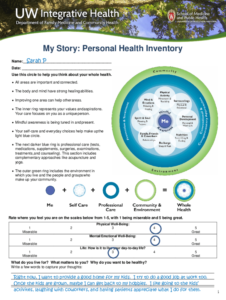 My Story: Personal Health Inventory Sarah P Name:___ Date: ___ Use this circle to help you think about your whole health. All areas are important and connected. The body and mind have strong healing