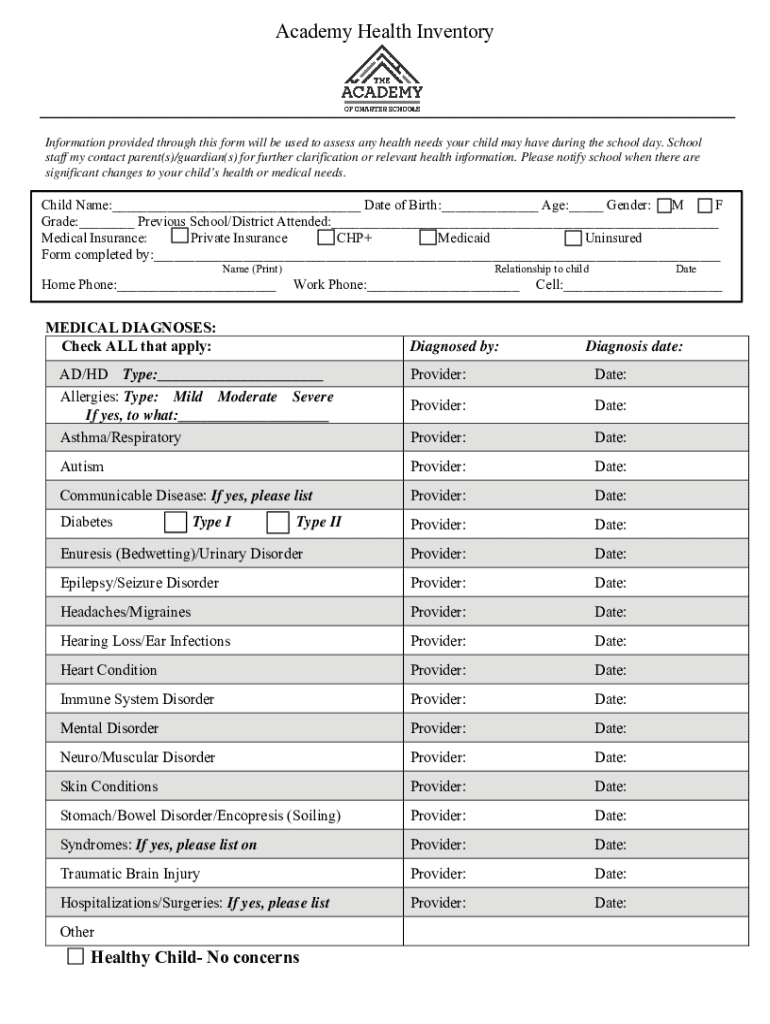 Academy Health InventoryInformation provided through this form will be used to assess any health needs your child may have during the school day. School staff my contact parent(s)/guardian(s) for