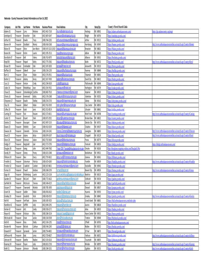Get the free Nebraska - County Treasurers Contact Information as of Jan 14 ...
