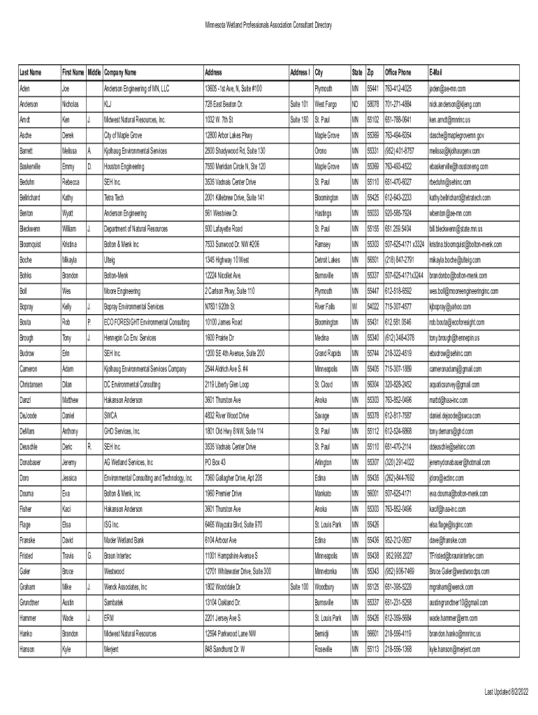 Minnesota Wetland Professionals Association Consultant DirectoryLast NameFirst Name Middle Company NameAddressAdenJoeAnderson Engineering of MN, LLC13605 1st Ave, N, Suite #100AndersonNicholasKLJ728
