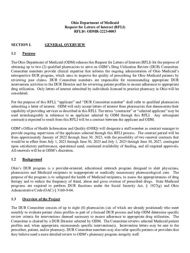 Ohio Department of Medicaid Request for Letters of Interest (RFI) RFI#: ODMR22230003 SECTION I. 1.1GENERAL OVERVIEWPurposeThe Ohio Department of Medicaid (ODM) releases this Request for Letters of
