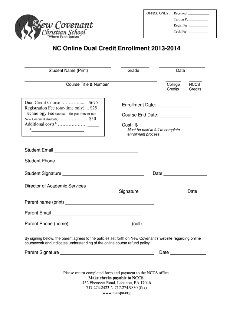 OFFICE ONLY: Received Tuition Pd Aegis Fee Tech Fee NC Online Dual Credit Enrollment 2013-2014 Student Name (Print) Grade Date Dual Credit Course .... ×675 Registration Fee (one-time only) ... ×25