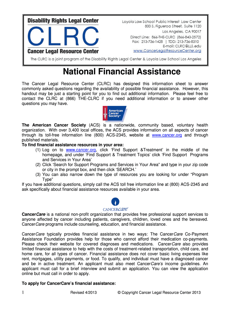 National Financial Assistance The Cancer Legal Resource Center (CLR) has designed this information sheet to answer commonly asked questions regarding the availability of possible financial assistance.