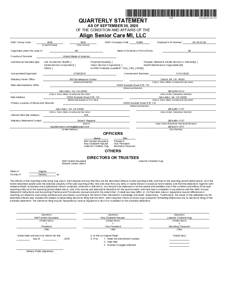 165802020201001032020QUARTERLY STATEMENTDocument Code: 201AS OF SEPTEMBER 30, 2020, OF THE CONDITION AND AFFAIRS OF Healing Senior Care MI, LLC NAIL Group Code4950,4950(Current Period)NAIL Company