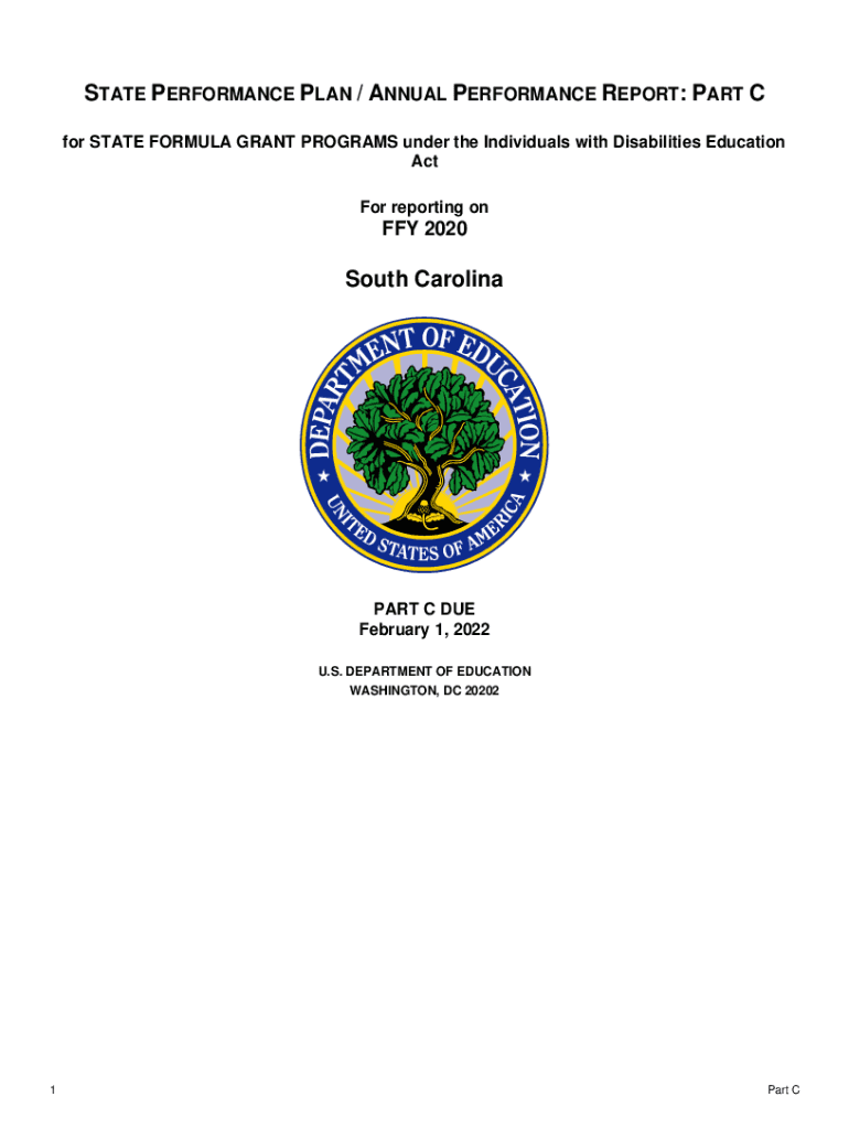 STATE PERFORMANCE PLAN / ANNUAL PERFORMANCE REPORT: PART C for STATE FORMULA GRANT PROGRAMS under the Individuals with Disabilities Education Act For reporting only 2020South CarolinaPART C DUE February