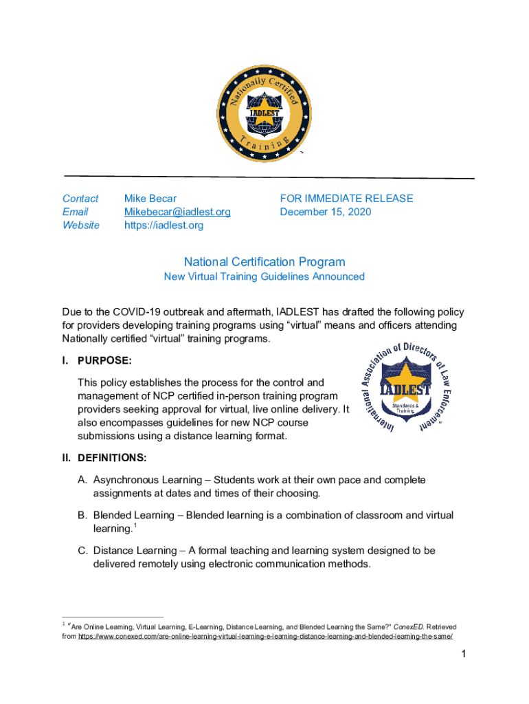 Contact Email Website Mike Bear Mikebecar@iadlest.org https://iadlest.orgFOR IMMEDIATE RELEASE December 15, 2020National Certification Program New Virtual Training Guidelines Announced Due to the