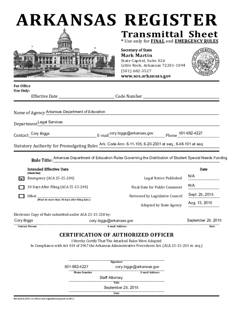 ARKANSAS REGISTERTransmittal Sheet* Use only for FINAL and EMERGENCY RULES Secretary of State Mark Martin State Capitol, Suite 026 Little Rock, Arkansas 722011094 (501) 6823527www.SOS.Arkansas.gov