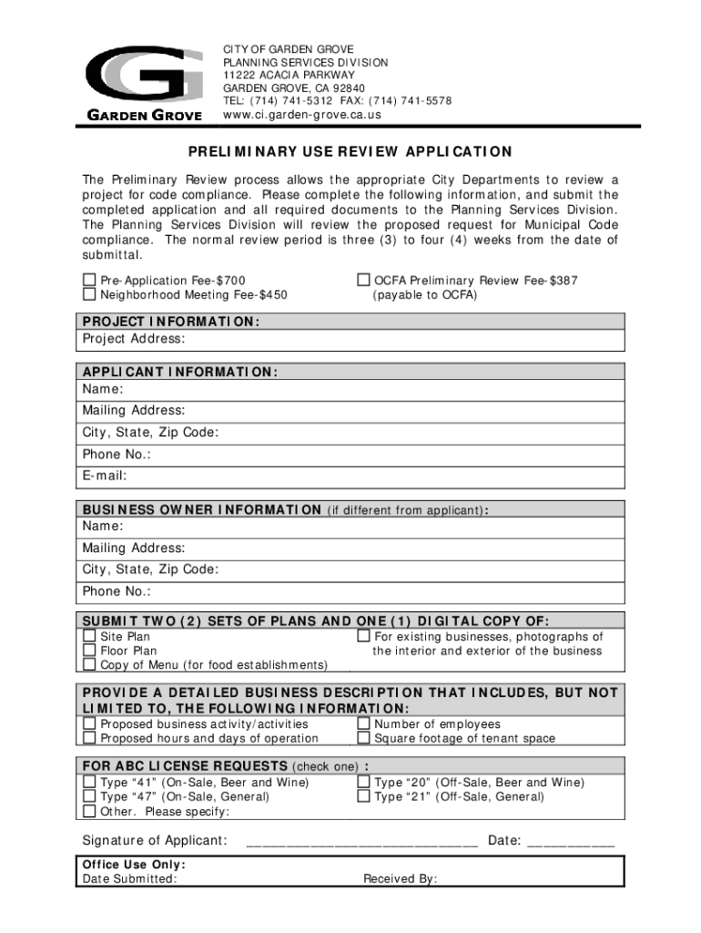 CITY OF GARDEN GROVE PLANNING SERVICES DIVISION 11222 ACACIA PARKWAY GARDEN GROVE, CA 92840 TEL: (714) 7415312 FAX: (714) 7415578www.CI. Garden Grove.ca.preliminary USE REVIEW APPLICATION The Preliminary