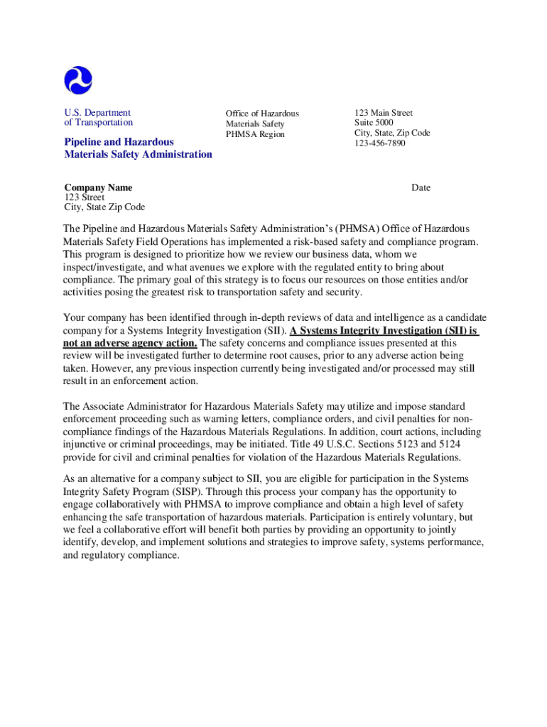U.S. Department of TransportationPipeline and Hazardous Materials Safety Administration Company Name 123 Street City, State Zip OpenOffice of Hazardous Materials Safety PH MSA Region123 Main Street