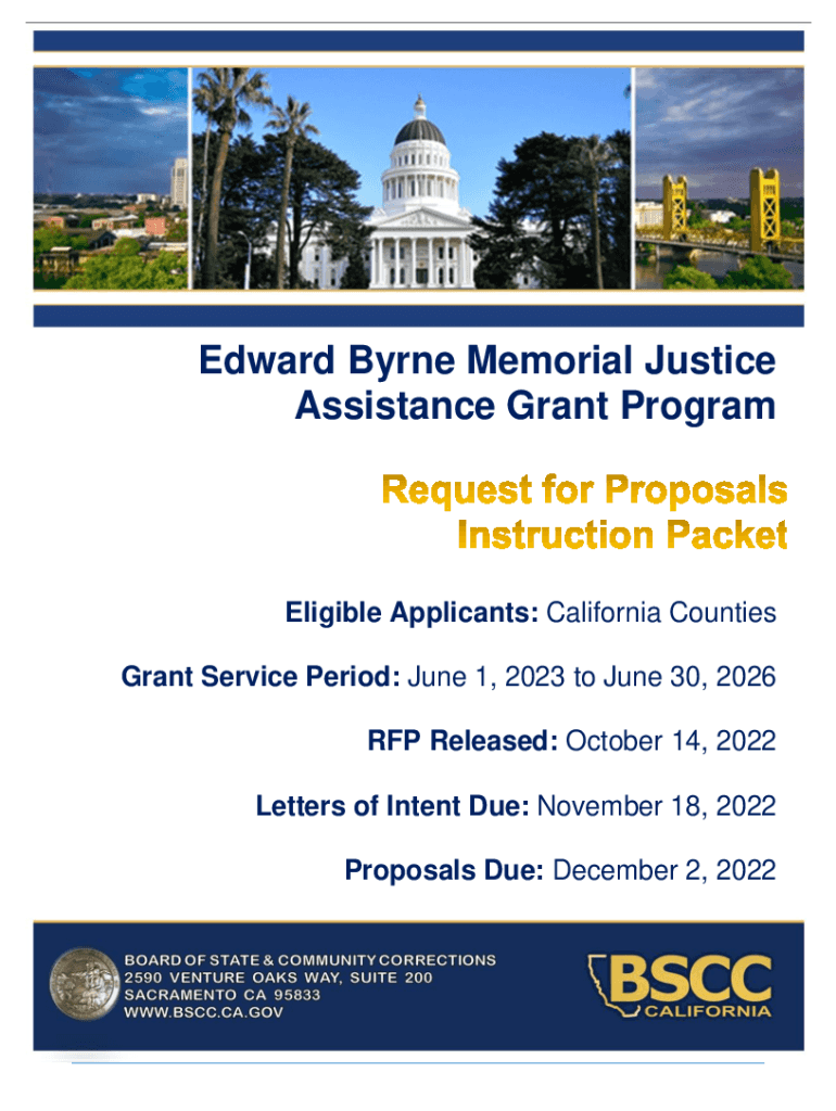 Edward Byrne Memorial Justice Assistance Grant ProgramEligible Applicants: California Counties Grant Service Period: June 1, 2023, to June 30, 2026 RFP Released: October 14, 2022, Letters of Intent
