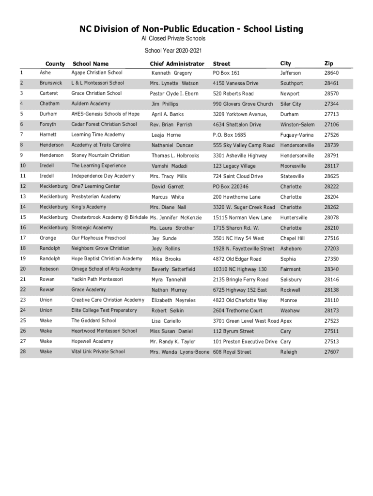 NC Division of Nonpublic Education School Listing All Closed Private Schools School Year 20202021 StreetCityZipPO Box 161Jefferson28640Mrs. Lynette Watson4150 Vanessa DriveSouthport28461Pastor Clyde