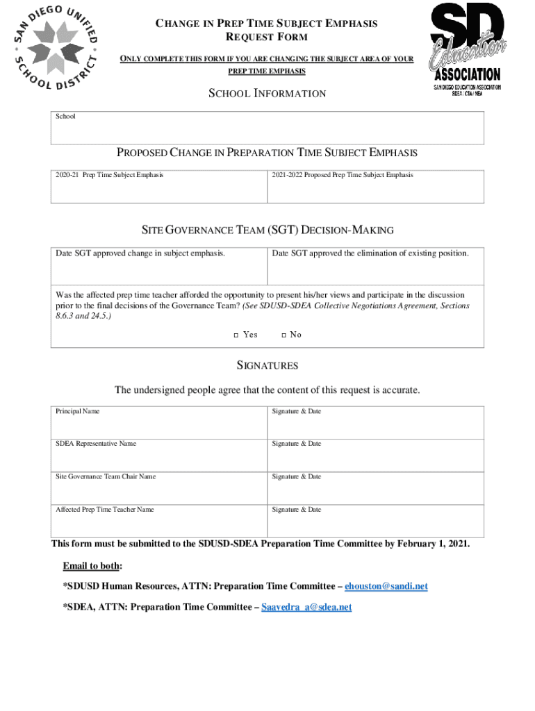 Get the free change in prep time subject emphasis request form