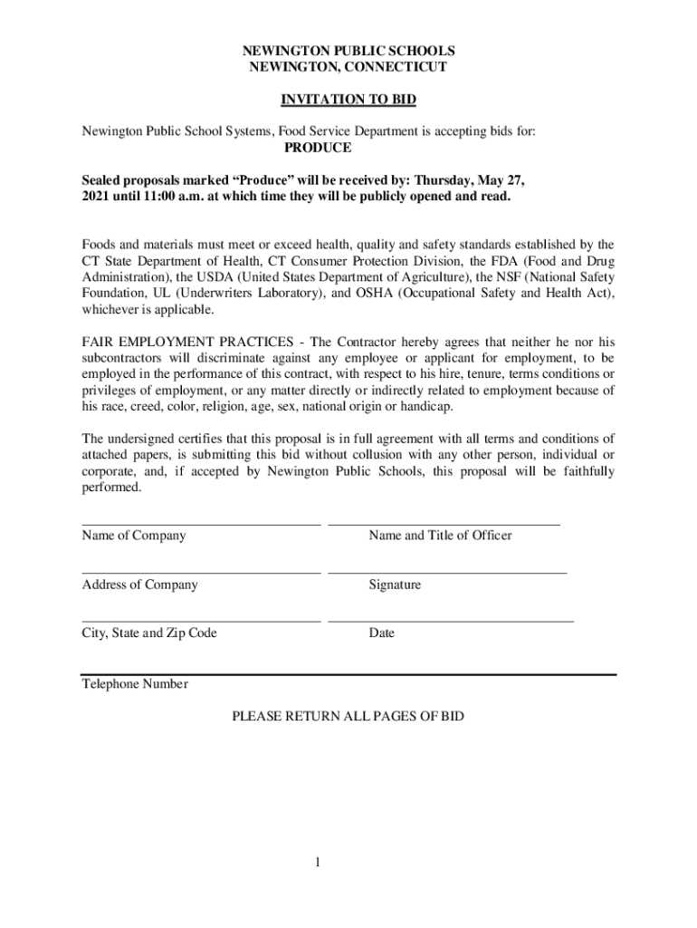 NEWINGTON PUBLIC SCHOOLS NEWINGTON, CONNECTICUT INVITATION TO BID Newington Public School Systems, Food Service Department is accepting bids for: PRODUCE Sealed proposals marked Produce will be received