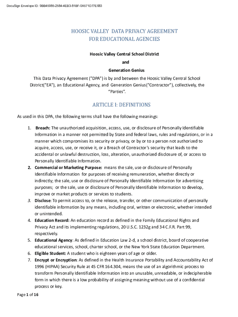 DocuSign Envelope ID: 9BB4598525844EB381BF0A571D77E683 26D6731712DD496E815820EA0C2A7DEEHOOSIC VALLEY DATA PRIVACY AGREEMENT FOR EDUCATIONAL AGENCIES Hoosier Valley Central School District and Generation