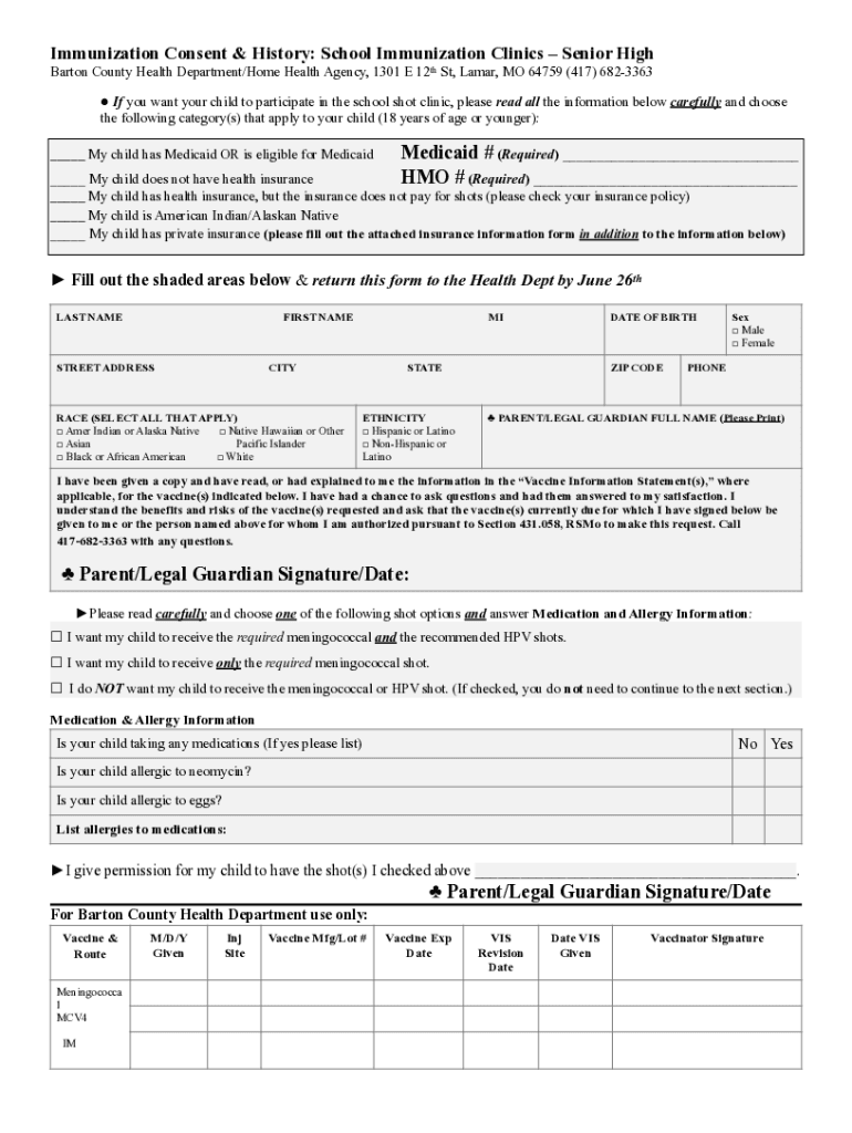 Immunization Consent & History: School Immunization Clinics Senior High Barton County Health Department/Home Health Agency, 1301 E 12th St, Lamar, MO 64759 (417) 6823363 If you want your child to