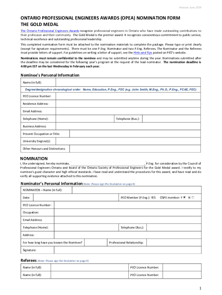 Revised: June 2019ONTARIO PROFESSIONAL ENGINEERS AWARDS (OPEN) NOMINATION FORM THE GOLD MEDAL The Ontario Professional Engineers Awards recognize professional engineers in Ontario who have made outstanding