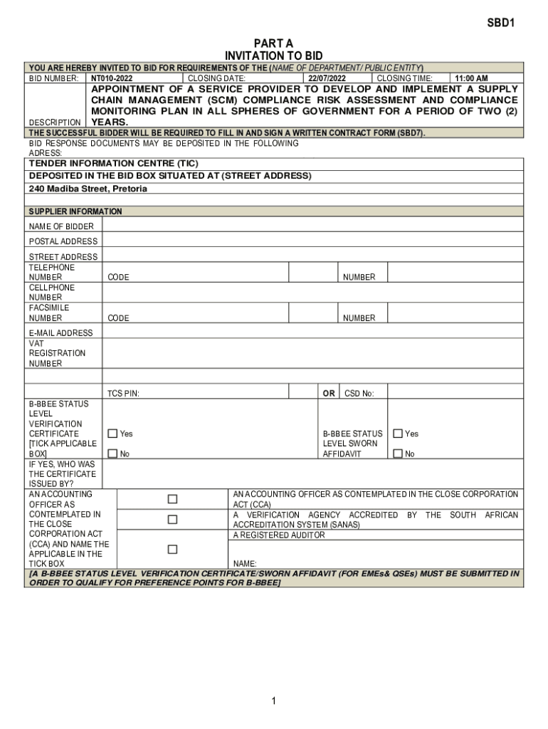 SBD1 PART A INVITATION TO BID YOU ARE HEREBY INVITED TO BID FOR REQUIREMENTS OF THE (NAME OF DEPARTMENT/ PUBLIC ENTITY) BID NUMBER: NT0102022 CLOSING DATE: 22/07/2022 CLOSING TIME:11:00 APPOINTMENT
