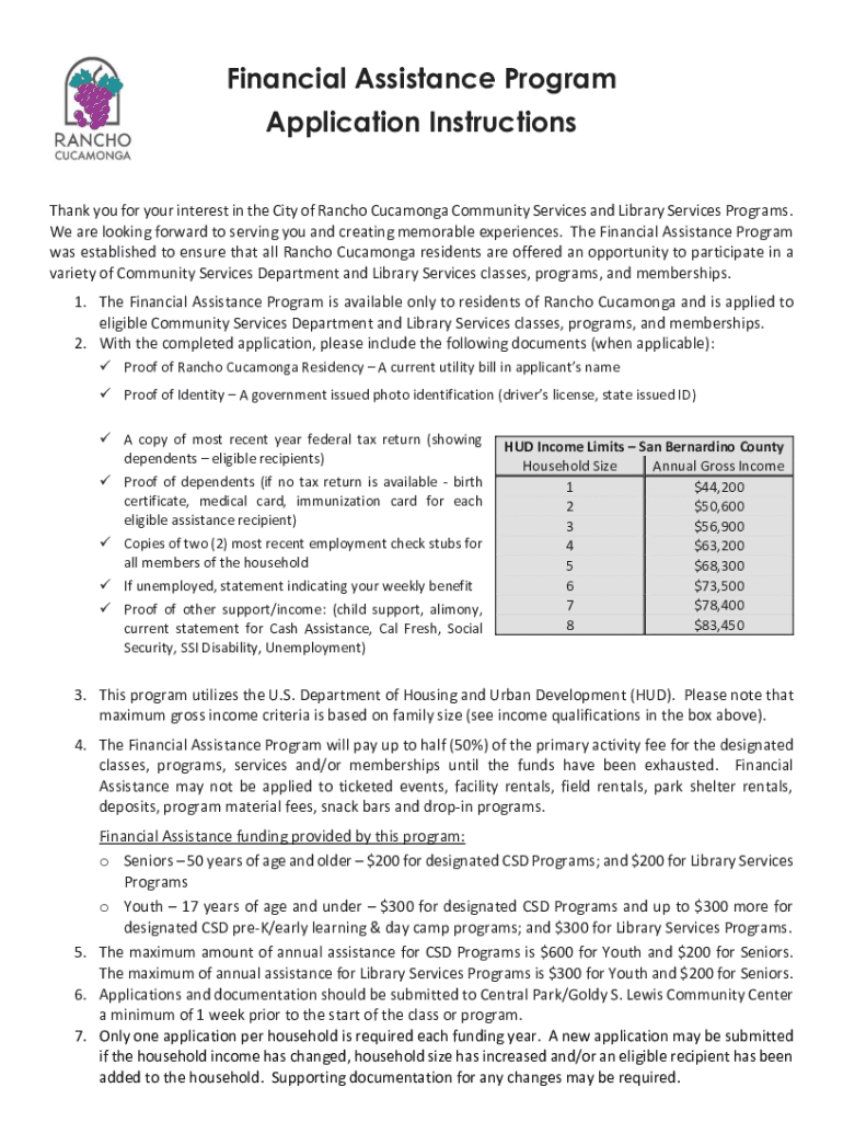 Financial Assistance Program Application Instructions Thank you for your interest in the City of Rancho Cucamonga Community Services and Library Services Programs. We are looking forward to serving