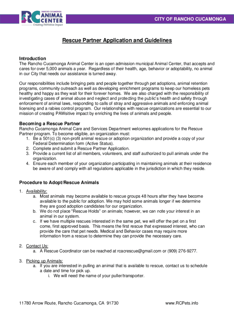 CITY OF RANCHO CUCAMONGARescue Partner Application and Guidelines Introduction The Rancho Cucamonga Animal Center is an open admission municipal Animal Center, that accepts and cares for over 5,000