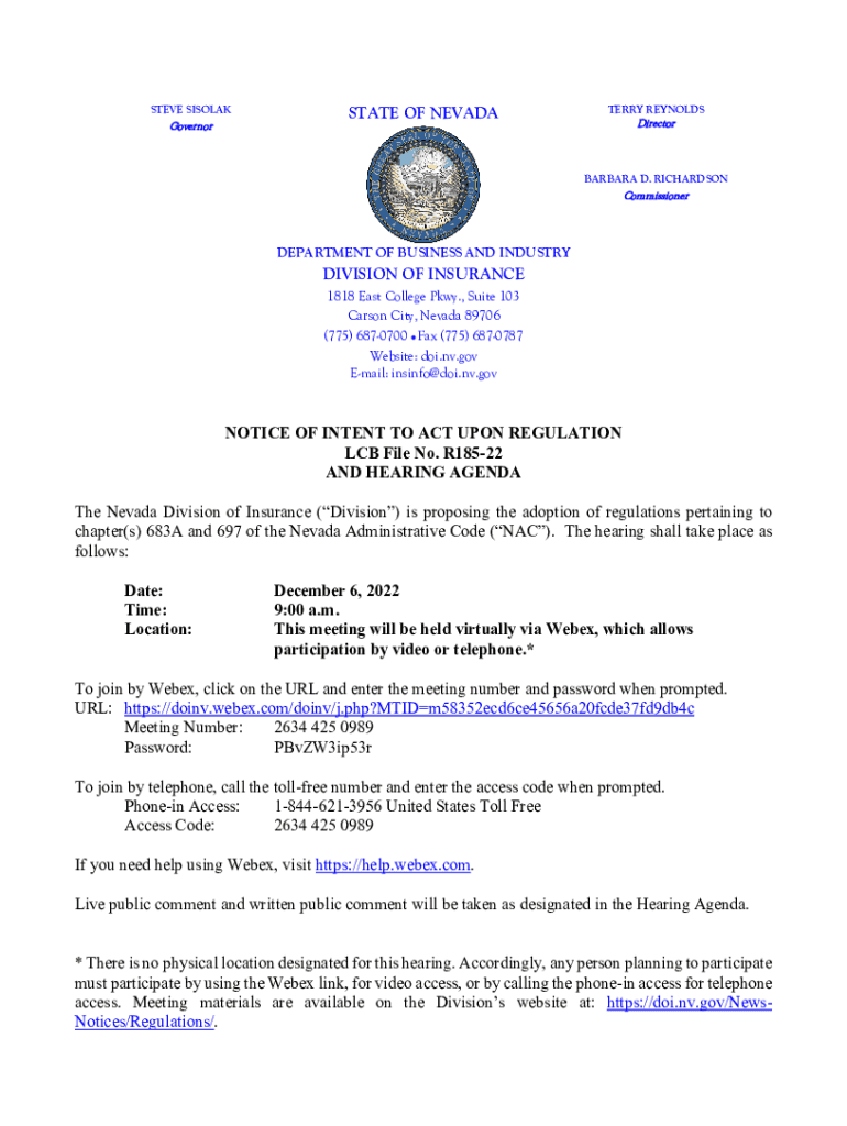 STEVE SISOLAKGovernorSTATE OF NEVADATERRY REYNOLDSDirectorBARBARA D. RICHARDSONCommissionerDEPARTMENT OF BUSINESS AND INDUSTRYDIVISION OF INSURANCE 1818 East College Pkwy., Suite 103 Carson City,