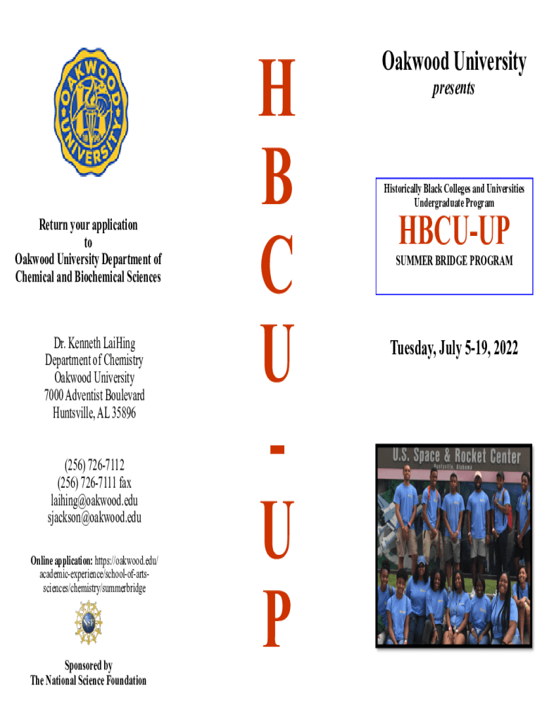 Return your application to Oak wood University Department of Chemical and Biochemical Sciences Dr. Kenneth Lashing Department of Chemistry Oak wood University 7000 Adventist Boulevard Huntsville,