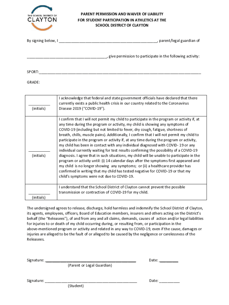 PARENT PERMISSION AND WAIVER OF LIABILITY FOR STUDENT PARTICIPATION IN ATHLETICS AT THE SCHOOL DISTRICT OF Clayton signing below, I ___, parent/legal guardian of___, give permission to participate
