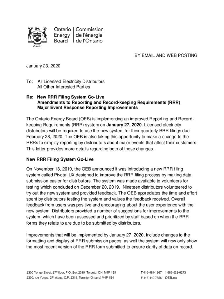 BY EMAIL AND WEB POSTING January 23, 2020To:All Licensed Electricity Distributors All Other Interested Parties Re: New RRR Filing System Olive Amendments to Reporting and Record keeping Requirements