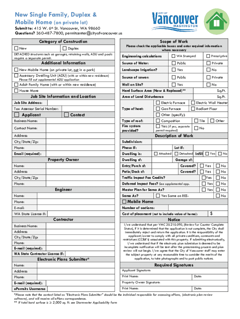 New Single Family, Duplex & Mobile Home (on private lot)Submit to: 415 W. 6th St. Vancouver, WA 98660 Questions? 3604877800, permitcenter@cityofvancouver.usCategory of Construction NewDuplexDETACHED
