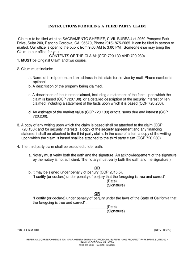 INSTRUCTIONS FOR FILING A THIRD PARTY CLAIM is to be filed with the SACRAMENTO SHERIFF, CIVIL BUREAU at 2969 Prospect Park Drive, Suite 200, Rancho Cordova, CA 95670, Phone (916) 8752665. It can be