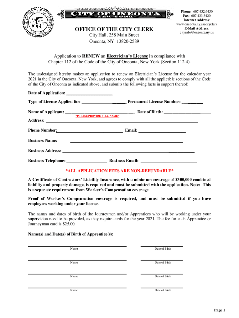 Phone: 607.432.6450 Fax: 607.433.3420 Internet Address: www.oneonta.ny.us/cityclerk Email Address: cityinfo@oneonta.ny.usOFFICE OF THE CITY CLERK City Hall, 258 Main Street Neon, NY 138202589Application