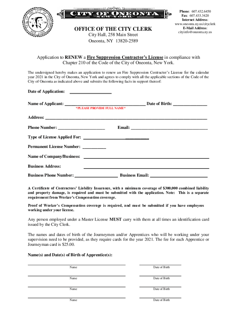 Phone: 607.432.6450 Fax: 607.433.3420 Internet Address: www.oneonta.ny.us/cityclerk Email Address: cityinfo@oneonta.ny.usOFFICE OF THE CITY CLERK City Hall, 258 Main Street Neon, NY 138202589Application