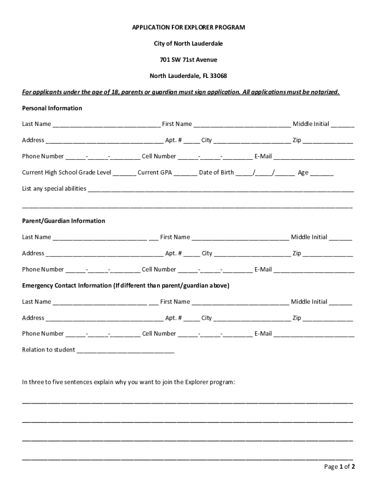 APPLICATION FOR EXPLORER PROGRAM City of North Lauderdale 701 SW 71st Avenue North Lauderdale, FL 33068 For applicants under the age of 18, parents or guardian must sign application. All applications