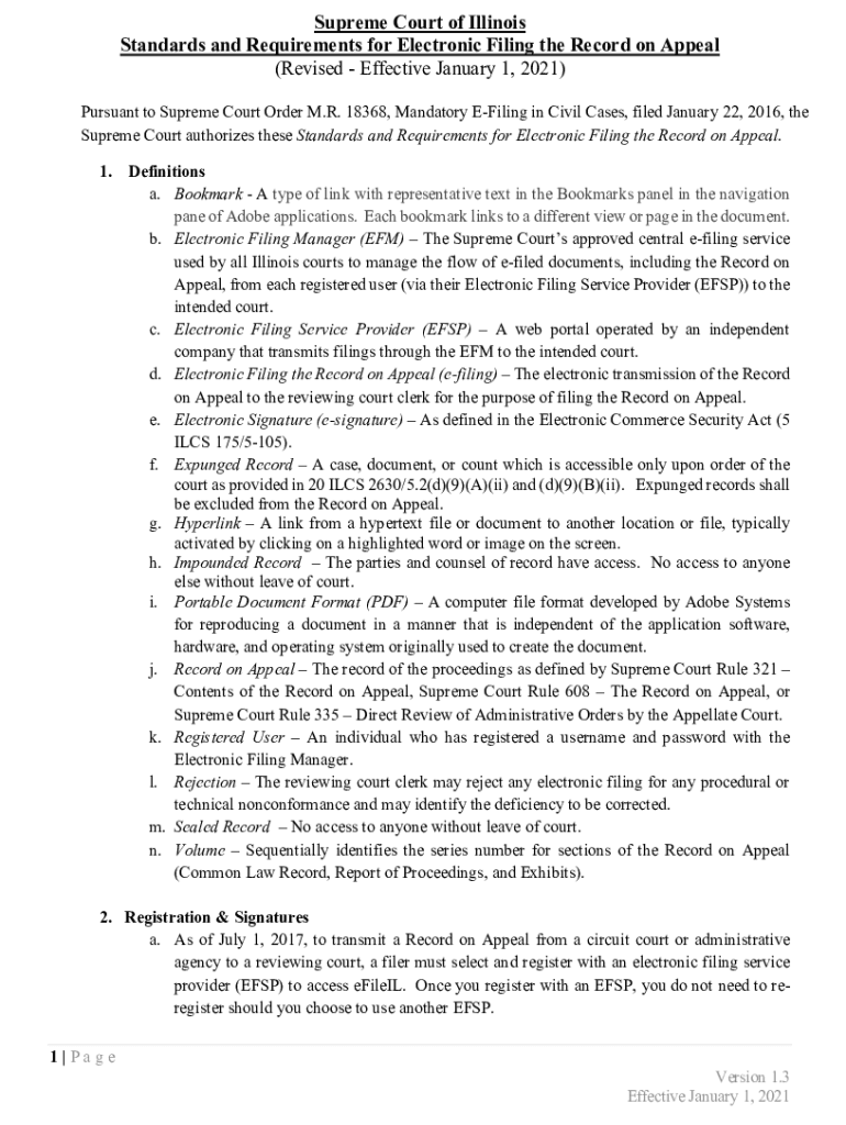 Supreme Court of Illinois Standards and Requirements for Electronic Filing the Record on Appeal (Revised Effective January 1, 2021) Pursuant to Supreme Court Order M.R. 18368, Mandatory Filing in